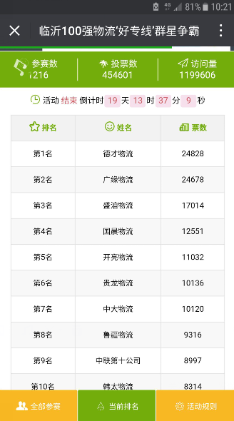 感谢有您们的陪伴让德才物流取得好的成果、最终票数62588,可想而之有多少人在支持德才,有你们的支持让德才更前进了一步,所以德才物流会更加努力做的更好!